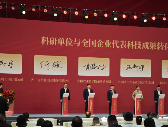 在大会重要签约环节,四川省茶业集团与中国农业科学院茶叶研究所进行科技成果转化签约,这是集团深化产学研协同创新、推动科技赋能茶产业高质量发展的关键实践。作为长期深耕茶产业、以科技驱动发展为核心战略的龙头企业,四川省茶业集团近年来持续加强与国内顶尖科研院所的深度联动,始终致力于搭建 “科研 - 转化 - 生产” 一体化桥梁,将前沿茶学科研成果高效转化为实际生产力。此次合作将聚焦红茶产业高质量发展需求,重点围绕茶树优质品种改良、茶园绿色生产标准体系建立、红茶数字化加工技术研发与应用等核心领域,开展系统化、产业化落地实践。通过技术攻关与成果转化,集团将进一步推动红茶生产从传统 “经验制茶” 向标准化、精准化的 “标准制茶”“数字制茶” 转型升级,不仅为企业自身产品品质提升与产业竞争力增强注入核心动力,更将为构建现代化茶产业体系、引领川茶产业高质量发展提供可复制、可推广的实践路径。