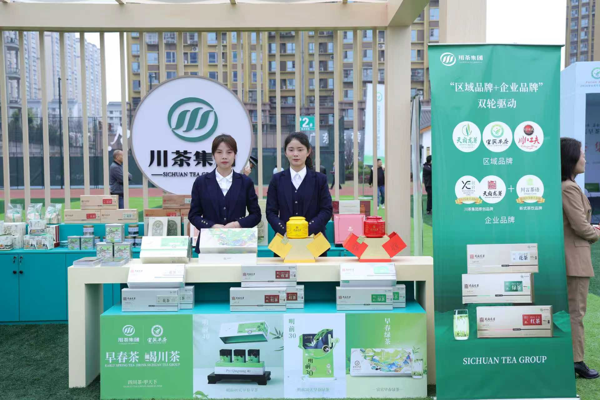 活动现场,四川省茶业集团精心打造极具东方美学与现代质感的专属展区,展区以原木格栅与青绿山水元素为基调,整体风格雅致大气,既传递出川茶的生态底蕴,又诠释了川茶自然本真的品牌内涵。展区内“宜宾早茶”“天府龙芽”“叙府”等多品牌产品矩阵有序陈列,从明前 50、天府龙芽经典绿茶等核心单品,到茶食品、新品茶药包、川言茶语新式茶饮等创新品类,全方位呈现集团全产业链布局与创新发展成果。展区人流络绎不绝,采购商、经销商与市民群众纷纷驻足品鉴、咨询洽谈,现场氛围热烈非凡。